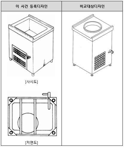 다만, 비교대상디자인의 저면을 구체적으로 확인할 수 있는 자료가 없어 이 사건 등록디자인의 저면과 자세하게 대비할 수는 없으나, 이 사건 등록디자인의 저면이 사각 형태로 받침다리가 부착된 형상이란 것은 비교대상디자인의 도면으로부터 알 수 있을 뿐 아니라, 이 사건 등록디자인의 저면과 같이 사각형태의 저면에 받침다리, 지지대, 배관 등이 부착된 형상과 모양은 냉면용 냉각기와 같은 물품의 제작에 통상적으로 필요한 것으로서 흔한 형상과 모양에 불과하다.