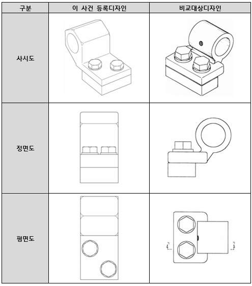 양 디자인은 모두, ① 그 전체적인 구조가 위로부터 순차로 축고정부, 지지부, 받침판으로 연결되는 구성을 취하고 있고, ② 축고정부는 지지부의 상단에 바로 연결되어 있으며, ③ 지지부와 받침판은 사각 형태로 되어 있고, ④ 지지부 위에 2개의 6각형 볼트가 결합되어 있다는 점에서 동일∙유사하여, 그 물품에서 사람의 주의를 끌기 쉬운 특징적 요부를 공통적으로 갖추고 있는바, 양 디자인은 이러한 공통점으로 인하여 보는 사람에게 느껴지는 전체적인 심미감에 별다른 차이가 없다.