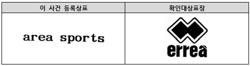 이 사건 등록상표는 영문자인 ‘area’와 ‘sports’를 좌우로 결합하여 구성되어 있다. 그런데, 확인대상표장은 윗부분에 도형을, 아랫부분에 영문자 ‘errea’를 상하로 배치하여 구성되어 있어서, 이 사건 등록상표와는 일부 영문자 알파벳 ‘rea’가 같다는 점을 제외하고는 나머지 영문자의 알파벳과 글자수 및 도형의 유무에 있어서 서로 다르다. 따라서, 이 사건 등록상표는 확인대상표장과는 전체적인 외관에 있어서 서로 다르다.
