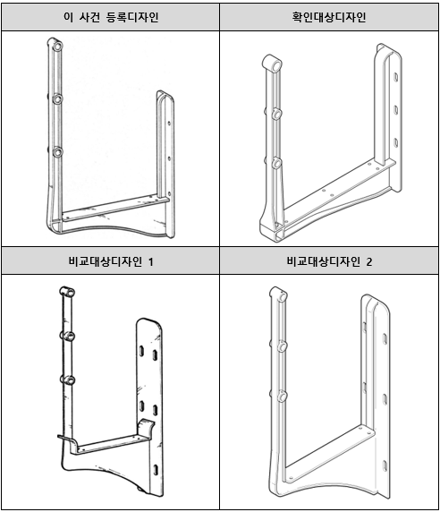 양 디자인은 모두, ① 우측은 다리 본체에 고정시키기 위한 고정브라켓, 좌측은 난간을 설치하기 위한 난간브라켓, 바닥은 사람이 걸어다니는 발판을 설치할 수 있는 지지브라켓으로 구성되어 있는데, ② 고정 브라켓에는 6개의 고정공이 형성되어 있고, ③ 난간브라켓에는 3개의 핸드레일삽입공이 형성되어 있으며, ④ 지지브라켓의 하부가 난간브라켓에서 고정브라켓으로 갈수록 그 두께가 커지는 곡면 형상을 이루고 있고, ⑤ 난간브라켓이 ‘H형’ 단면이어서 정면을 기준으로 양 끝단에 돌기의 테두리가 있으며, ⑥ 지지브라켓의 발판이 직사각형을 이루고 있고, ⑦ 고정브라켓에는 보강리브가 결합되어 있는데, 그 단면은 ‘⊦’와 같아서 보강리브의 양측 끝단에 돌기의 테두리가 있으며, ⑧ 지지브라켓의 하부 보강리브에도 돌기의 테두리가 형성되어 있고, ⑨ 고정브라켓의 보강리브의 상단이 만곡형상을 이루고 있으며, ⑩ 고정브라켓의 교각접면부의 상단 두 모서리가 둥글게 된 직사각형의 형상으로 되어 있는 점에서 동일∙유사하여, 그 물품에서 사람의 주의를 끌기 쉬운 특징적 요부를 공통적으로 갖추고 있는바, 양 디자인은 이러한 공통점으로 인하여 보는 사람에게 느껴지는 전체적인 심미감에 별다른 차이가 없다고 할 것이다.