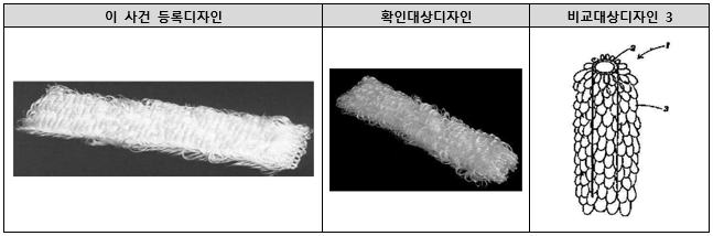 확인대상디자인과 비교대상디자인 3은 전체적인 형태가 일정한 직경을 가진 원통 형상의 중공부를 가지면서 길이방향으로 길게 연속된 형상으로 되어 있어 동일한 방향으로 연속 반복된 느낌을 갖도록 한다. 또한, 확인대상디자인의 표면은 무수한 타원형의 루프가 한쪽 방향으로 누워 겹쳐지면서 길이 방향으로 연속하여 반복되는 형상으로 되어 있어 타원형의 루프가 한쪽 방향으로 정렬된 느낌을 갖도록 하는바, 한편 비교대상디자인 3의 표면도 원통형상의 중공부의 유연한 유체(紐體, 매듭)의 외부를 둘러싸고 있는 무수한 단섬유(單纖維)의 타원형 루프가 한쪽 방향으로 누워 겹쳐지면서 길이 방향으로 연속하여 반복되는 형상으로 되어 타원형의 루프가 한쪽 방향으로 정렬된 느낌을 갖도록 한다.