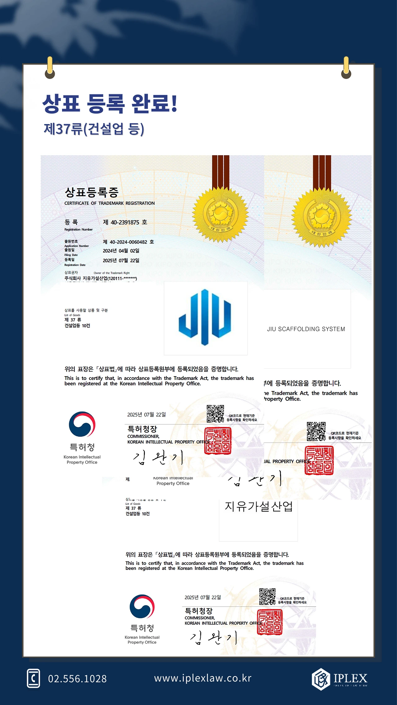 시스템 비계 및 가설 구조물 해체 분야에서 전문성을 인정받아온 지유가설산업은, 이번 상표 등록을 통해 기업명에 대한 독점적 사용권을 확보하고, 브랜드를 법적으로 보호할 수 있는 토대를 마련하였습니다.