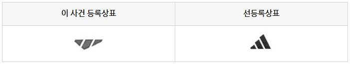 다음으로, 특히 도형상표에서 지배적인 인상을 남기는 외관에 관하여 대비하여 보건대, 이 사건 등록상표는 역삼각형에 가까운 형태로서 흰색 사선으로 인하여 세 개로 나뉘어져 있는 부분 중 가운데 부분은 역오각형이고 좌·우측 부분은 끝단으로 갈수록 폭이 좁아지며 대칭적으로 배치되어 있어서 전체적으로 날렵하고 동적인 인상을 주는 반면에, 선등록상표는 정삼각형에 가까운 형태로서 흰색 사선으로 인하여 세 개로 나뉘어져 있는 평행사변형 도형들이 좌측에서부터 점점 크기가 커지면서 차례로 계단식으로 쌓여져 있어서 전체적으로 무겁고 정적인 인상을 준다. 따라서, 두 상표가 비록 전체적으로 삼각형에 가까운 모양의 형상이고 흰색 사선으로 인하여 세 개로 나뉘어져 있는 점에서는 공통되지만, 앞에서 본 바와 같은 차이들(삼각도형 및 흰색 사선의 배치구조, 좌·우측 부분의 대칭구조 등)로 인하여 일반 수요자나 거래자들에게 주는 전체적인 인상이 완연히 달라 외관상 서로 유사하지 않다고 할 것이다. 결국 이 사건 등록상표와 선등록상표는 외관에서 서로 달라 일반 수요자나 거래 자들의 입장에서 객관적, 전체적, 이격적으로 관찰될 경우에 서로 유사하지 아니한 상표라고 할 것이다.