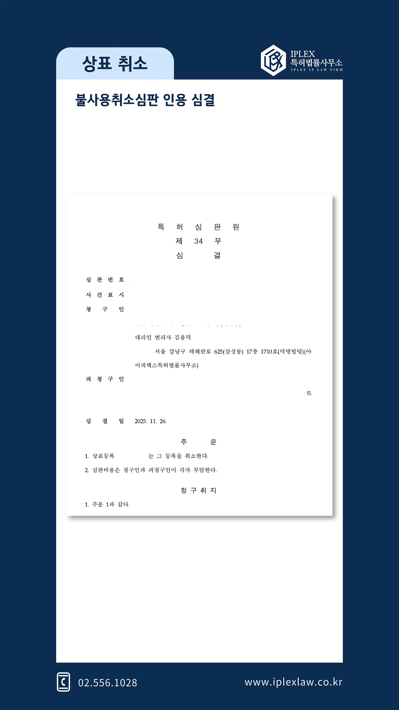 아이피렉스 특허법률사무소는 출원 과정에서 문제가 됐던 선행 상표가 3년 이상 불사용했다는 요건을 충족함을 입증하여, 존속 중이던 등록상표를 불사용 취소 심판을 통해 성공적으로 제거하였고, 이를 통해 고객의 핵심 브랜드 등록 가능성을 명확히 확보하였습니다.