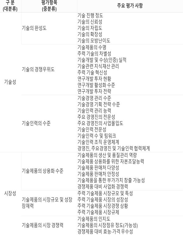 기술성 항목에는 3가지 평가항목(기술의 완성도, 기술의 경쟁우위도, 기술인력의 수준)이, 시장성 부문에도 3가지 평가항목(기술 제품의 상용화 수준, 기술 제품의 시장규모 및 성장 잠재력, 기술 제품의 시장 경쟁력)이 필수로 들어가게 됩니다. 그리고, 기술 평가에 뒷받침되도록 권리성 평가도 같이 진행될 수 있습니다.