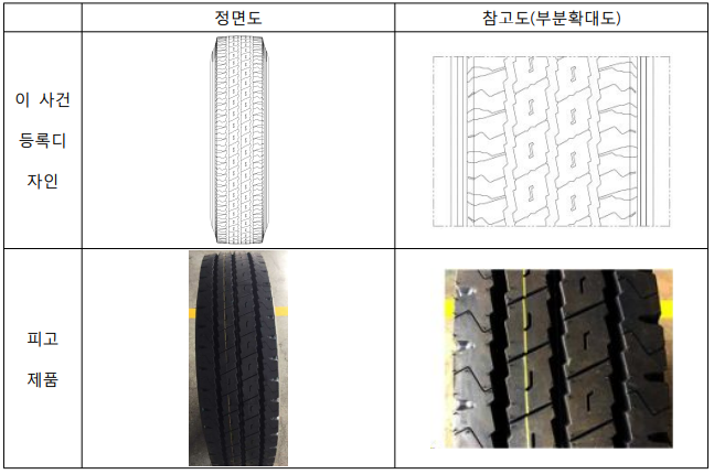공통점 ④, ⑤에 관하여 보면, 등록디자인의 가장자리부 가로선의 구체적 모양 및 등록디자인과 같이 가장자리부에 얇은 가로선과 홈을 일정한 간격으로 형성하는 것 자체는 선행디자인들에 이미 나타나 있으므로 등록디자인과 피고 제품의 미감에 별 영향을 주지 아니한다. 오히려 가장자리부의 홈은 타이어의 사용 상태에 따라 정면에서는 물론 측면에서 볼 수도 있으므로 그 구체적 형상이 미감에 상당한 영향을 미친다고 할 것이며, 가장자리부의 홈의 구체적 형상은 등록디자인의 특징적 부분이기도 하다. 그런데 가장자리부의 홈의 구체적 형상의 차이로 인하여 공통점 ④, ⑤에도 불구하고 등록디자인은 홈이 가장자리부를 전체적으로 일부 절단한 듯한 느낌을 주는 반면, 피고 제품은 가장자리부의 끝 부분만 파낸 느낌을 주고, 이로 인하여 등록디자인과 피고 제품은 미감에서 상당한 차이가 있다.