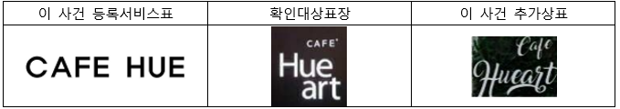 확인대상표장은 ‘휴아트’로 호칭되어 짧은 3음절에 불과하고 한 번에 호칭될 것으로 보이며, ‘Hue’ 부분과 ‘art’ 부분은 동일한 서체·크기로 상, 하단으로 일정 구간을 겹쳐서 배열되어 있어 밀접하게 결합되어 있다. 확인대상표장 중 ‘Hue’ 부분과 ‘art’ 부분은 각각 그 부분이 그 자체로 주지∙저명하다거나 일반 수요자에게 강한 인상을 주는 부분이라고 보기도 어렵다. 원고는 피고가 확인대상표장 외에도 이 사건 추가표장을 함께 사용하고 있다고 주장하는데(피고는 다투지 않는다), 이 사건 추가표장 중 사용서비스업인 카페업 등을 가리켜 식별력이 없다고 볼 수 있는 ‘cafe’ 부분을 제외하고는 확인대상표장의 상단과 하단을 합한 ‘Hueart’라는 호칭을 사용하고 있어, 확인대상표장을 사용하는 피고는 확인대상표장의 ‘Hue’ 부분과 ‘art’ 부분을 결합하여 호칭한다는 것을 알 수 있고, 일반 수요자 및 거래자들 역시 확인대상표장과 함께 이 사건 추가표장을 접할 경우, 확인대상표장을 ‘휴아트’로 인식할 가능성이 크다. 또한, ‘Hue’ 부분은 ‘빛깔, 색채’ 등의 의미를 갖고, ‘art’ 부분은 ‘예술’이라는 뜻을 가지고 있으며, ‘Hue’ 부분은 ‘art’ 부분과 대등하게 연결되어 있으며, 크기나 비중 등에 있어서도 ‘art’ 부분과 별다른 차이가 없는 점에 비추어 확인대상표장 중 ‘Hue’ 부분이 ‘art’ 부분과 비교할 때 상대적으로 식별력이 높다고 보기 어렵다. 이러한 점을 종합하여 볼 때, 확인대상표장은 그 중 ‘Hue’ 부분만이 독립하여 서비스업의 출처표시기능을 수행한다고 볼 수는 없고, ‘Hue’ 부분과 ‘art’ 부분이 전체로서 이 사건등록서비스표의요부인 ‘Hue’ 부분과 대비하여 그 유사 여부를 판단하는 것이 타당하다. 이 사건 등록서비스표와 확인대상표장을 대비하면, 양 표장은 ‘art’ 부분의 유무에 따라 외관이 상이하다. 또한 이 사건 등록서비스표는 요부가 ‘휴’로 호칭됨에 반해 확인대상표장의 요부는 ‘휴아트’로 호칭되어 그 호칭에 차이가 있다. 이 사건 등록서비스표는 ‘빛깔, 색채’ 등으로 관념됨에 반해 확인대상표장은 사전에 등재되지 아니한 조어로서 별다른 관념을 갖지 않아 그 관념을 대비하기 어렵다.