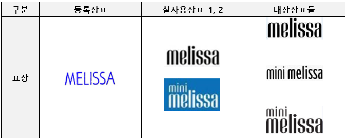 먼저 양 표장의 외관에 관하여 살펴보건대, 등록상표ㆍ서비스표의 경우 별다른 도형 부분 없이 푸른색의 영어 대문자인 ‘MELISSA’로 이루어진 문자 표장이다. 한편, 실사용상표 1의 경우 역시 별다른 도형 부분 없이 검은색의 영어 소문자인 ‘melissa’로 이루어진 문자 표장이다. 이와 같이 등록상표∙서비스표와 위 실사용상표1은 모두 영어 알파벳으로 이루어진 문자 표장으로서, 소문자와 대문자 여부, 글자체, 색상에서 다소 차이가 있으나, 모두 동일한 영어 알파벳으로 이루어진 문자 표장이라는 점에서 외관에 있어 상당히 유사하다.