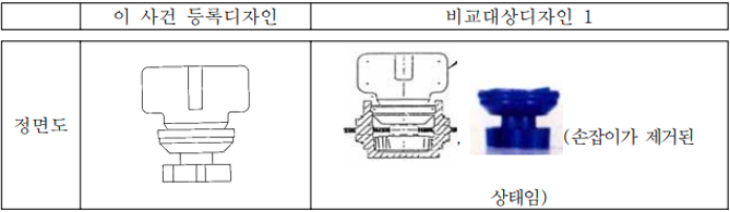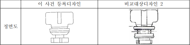 반면에 두 디자인은, 이 사건 등록디자인의 톱니 부분은 각이 진 4개의 톱니가 중앙의 둥근 원판에 결합되어 있어 견고한 구조를 가진 형상인데 반하여, 비교대상디자인 1의 톱니 부분은 4개의 나선형 톱니가 하나로 연결되어 있어 봉인구 로크가 봉인구 몸체에 삽입되어 회전될 경우 톱니가 회전체 중심쪽으로 굽혀지며 회전될 수 있는 유연한 구조를 가진 형상인 점에서 차이가 있다.
