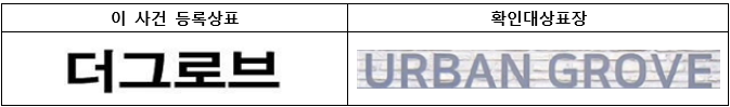 전체적으로 이 사건 등록상표와 확인대상표장을 관찰하면, ① 이 사건 등록상표는 한글표장이고, 확인대상표장은 영문 표장으로 그 외관이 확연히 다르다고 할 것이다. 또한, ② 이 사건 등록상표는 ‘더그로브’로 호칭되고, 확인대상표장은 ‘어반 그로브’로 호칭되므로, 이 사건 등록상표와 확인 대상표장은 그 호칭에 있어서도 유사하다고 할 수 없다. 마지막으로 ③ 이 사건 등록상표는 그 지정상품과 관련하여 ‘작은 숲 또는 수풀 속의 카페’로 관념을 가진다고 하더라도 확인대상표장은 ‘도심 속’이라는 관념을 더 포함하고 있으므로 이 사건 등록상 표와 확인대상표장은 그 관념에 있어서도 유사하다고 보기 어렵다.