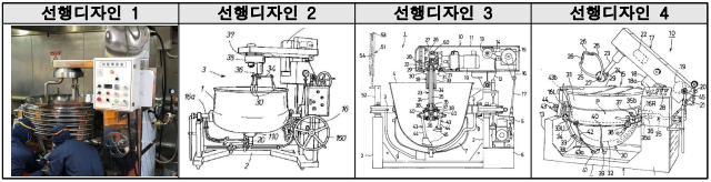 이 사건 등록디자인과 확인대상디자인의 공통점 중 중앙의 솥을 포함하는 교반부와 연장 프레임, 지지기둥, 하부받침대 등으로 구성된 프레임부 및 ‘기타 부분’의 결합 위치 및 결합 후 전체적인 형상 관련 부분은 아래 표에서 보는 바와 같이 선행디자인 1 내지 4에 이미 나타나 있다. 따라서 이 부분 공통점들은 이 사건 등록디자인과 확인대상디자인의 유사 여부 판단에서 그 중요도를 낮게 보아야 한다.
