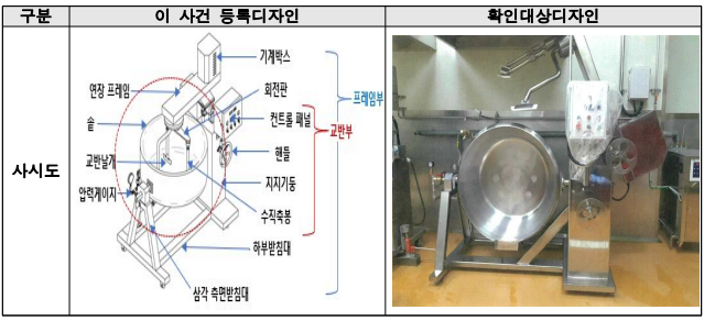 ㉠ 솥의 형상 및 폭(幅)과 관련하여 이 사건 등록디자인은 솥의 상부와 하부의 폭이 같고 솥의 측면이 밑면과 수직을 이루는 반면, 확인대상디자인은 솥의 측면이 내부를 향해 경사져 있어서 상부에서 하부로 갈수록 폭이 좁아지는 형상이다. ㉡ 압력게이지의 형상과 관련하여 이 사건 등록디자인은 ‘U’자 형이나 확인대상디자인은 ‘|’자 형이다. ㉢ 이 사건 등록디자인에는 지지기둥 이외에 별도의 지지대는 없지만 확인대상디자인은 지지기둥 좌측으로 45° 기울어진 하부받침대보다 굵은 별도의 지지대가 있다. ㉣ 핸들과 관련하여, 이 사건 등록디자인에는 1개의 둥근 핸들이 설치되어 있고 핸들 내부에 설치된 중심원을 기준으로 5갈래로 나뉘는 가지가 추가로 설치되어 각 5개의 공간은 삼각형상을 띄는 반면, 확인대상디자인은 2개의 입체감이 적은 원반 형 핸들이 설치되어 있되 각 핸들의 내부에는 5개의 타원형 공간이 형성되었다. ㉤ 컨트롤 패널과 관련하여, 이 사건 등록디자인은 가로로 긴 형태를 띤 컨트롤 패널에 8개의 버튼이 있으나 확인대상디자인은 세로로 긴 형태를 띤 컨트롤 패널에 6개의 버튼이 있다. ㉥ 식품 혼합 조리기의 작동상태에서의 기계박스 위치와 관련하여 이 사건 등록디자인은 컨트롤 패널 바로 위에 있지만 확인대상디자인은 컨트롤 패널의 우측 상단에 있다.
