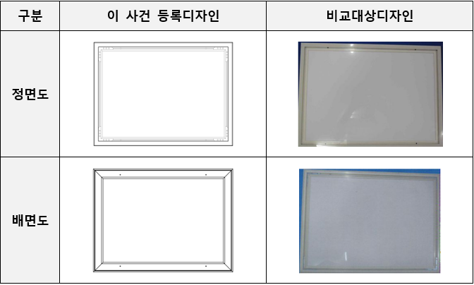 한편, 이 사건 등록디자인에는 하부판에 있는 홈의 네 모서리 부분에 ‘ㄱ자형 부재’가 있는 반면, 비교대상디자인에는 해당 부분에 ㄱ자형 부재가 없고, 양 디자인의 바깥쪽 틀과 안쪽 틀의 폭의 비율 및 바깥쪽 틀과 안쪽 틀의 사이에 있는 것처럼 보이는 홈의 폭이 다소 상이하며, 배면에서 볼 때 이 사건 등록디자인은 홈이나 ㄱ자형 부재 또는 이와 유사한 부재가 없는 반면, 비교대상디자인 에는 바깥쪽 틀과 안쪽 틀 사이에 홈이 있고, 홈의 네 모서리 부분에 ㄱ자형 부재와 유사한 부재가 있는 차이가 있고, 이 사건 등록디자인의 하부판에는 상부판을 닫았을 때 상부판의 바깥쪽 틀에 가려지는 별도의 틀이 있는 반면, 비교대상디자인에는 이에 대응되는 부분이 없고 안쪽 틀의 바깥에는 단차가 있는 부분이 있을 뿐인데 상부판을 닫았을 때는 바깥쪽 틀과 안쪽 틀 사이에 홈이 있는 것처럼 보이는 차이가 있다.