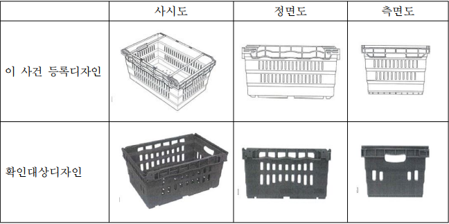 공통점 ⑤는 바닥부의 형태로서 눈에 잘 띄지 않는 부분에 관한 것이어서 심미감에 미치는 영향이 적으므로 그 중요도를 낮게 평가하여야 한다. 위와 같은 관점에서 이 사건 등록디자인과 확인대상디자인을 전체적으로 대비 관찰 할 경우, 확인대상디자인은 앞서 본 ㉠ 내지 ㉥의 차이점, 특히 비교적 폭이 넓은 통기 공들이 적당한 간격을 두고 배열되어 있는 점, 정면의 보강살 사이가 개방되어 있는 점, 비교적 폭이 넓은 손잡이 등으로 인해 보는 사람으로 하여금 전체적으로 간결하고 시원스럽게 개방된 느낌의 심미감이 느껴지게 하는 점에서 이 사건 등록디자인과 유사하지 아니하다.