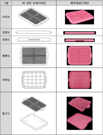이 사건 등록디자인과 확인대상디자인은 모두 ‘애완동물용 변대’에 관한 디자인으로서, 그 대상 물품이 동일하다.
