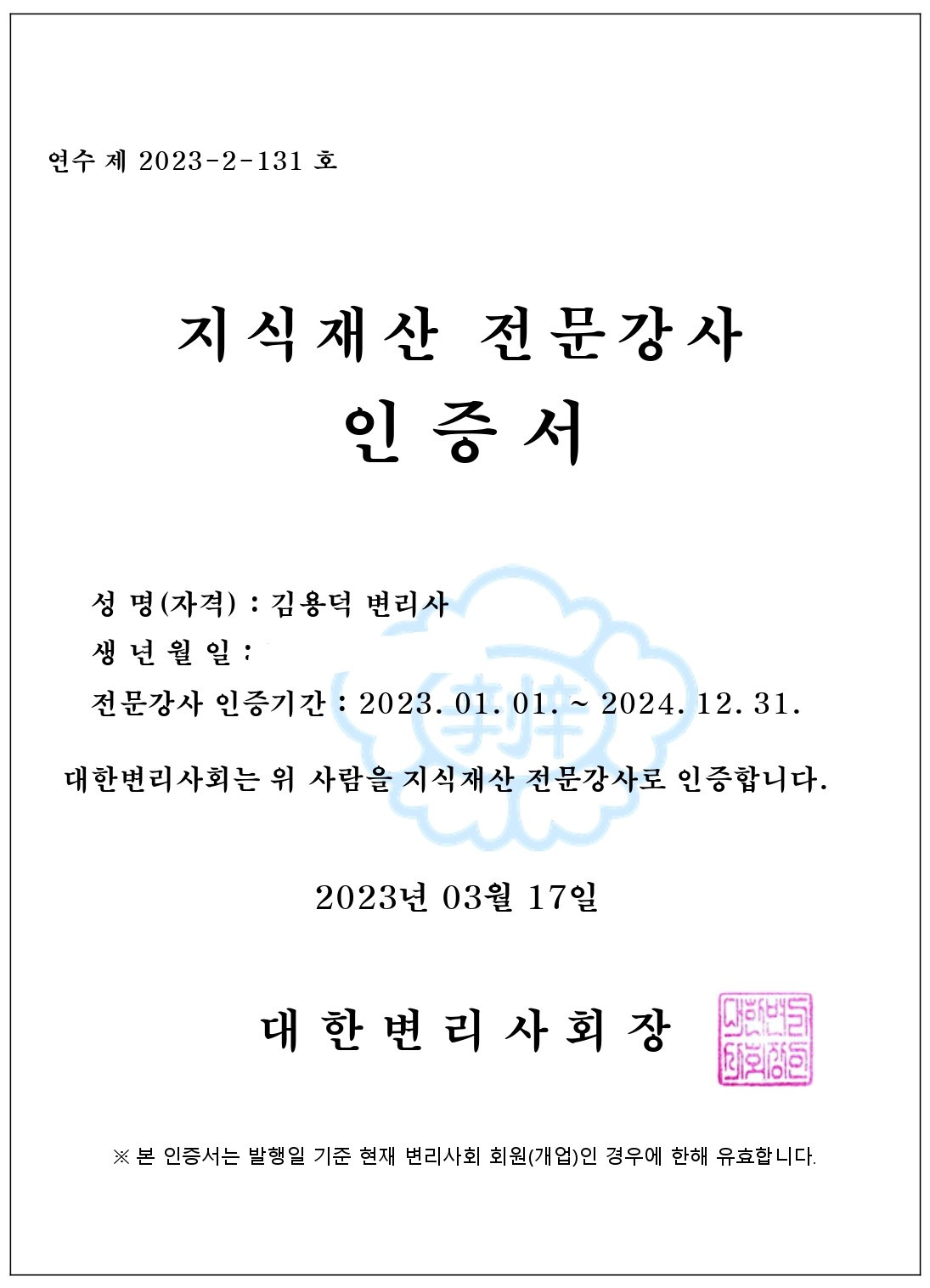 아이피렉스 특허법률사무소 김용덕 변리사가 지식재산 전문강사 인증을 받았다.