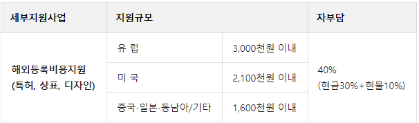해외 특허, 상표, 디자인 분야의 등록에 소요되는 비용 중 일부를 지원하며, 전북지식재산센터 컨설턴트 컨설팅 병행 제공