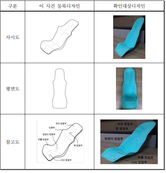 이 사건 등록디자인과 확인대상디자인의 차이점으로는, ① 이 사건 등록디자인은 목 받침부의 양측 부분이 날개 모양처럼 약간 외부로 돌출되어 있음에 비하여, 확인대상디자인은 목 받침부의 양측 부분이 외부로 돌출됨이 없이 그 외형선이 완만한 곡선으로 되어 있는 점, ② 이 사건 등록디자인은 목 받침부가 약간 볼록하게 돌출되어 있는 데 비하여, 확인대상디자인은 목 받침부가 거의 돌출되어 있지 않은 점, ③ 이 사건 등록디자인은 머리 받침부, 목 받침부, 엉덩이 받침부가 안쪽으로 완만하게 들어간 모양인 데 비하여, 확인대상디자인은 머리 받침부, 목 받침부, 엉덩이 받침부가 좀 더 안쪽으로 오목하게 들어간 모양인 점 등이 있다.