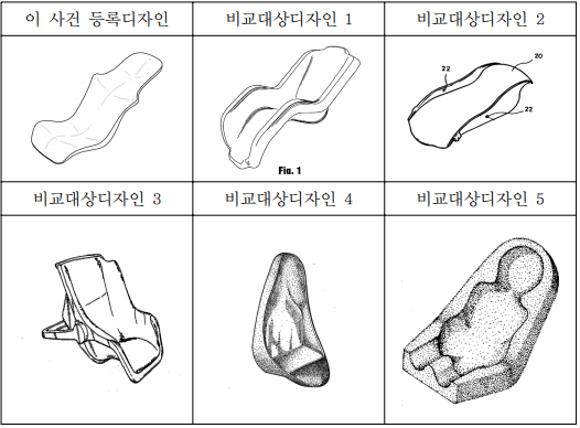 비교대상디자인들은 각각 유아용 흔들의자(비교대상디자인 1), 유아용 목욕 받침대(비교대상디자인 2, 4, 5), 유아용 캐리어(비교대상디자인 3)에 관한 디자인들로서, 수유용 받침구에 관한 이 사건 등록디자인과는 대상 물품의 구체적인 용도나 기능이 다르다. 또한, 비록 비교대상디자인들에 이 사건 등록디자인의 일부 구성요소가 나타나 있기는 하지만(공통점 ①은 비교대상디자인 5 등에, 공통점 ③, ④는 비교대상디자인 1, 3 등에, 공통점 ⑥은 비교대상디자인 1, 4, 5 등에 각각 나타나 있다), 이 사건 등록디자인과 비교대상디자인들은 그 각 구성 요소와 그 전체적인 결합 형태 자체에서 상당한 차이가 발견된다. 나아가 등록된 디자인을 구성하는 개개의 형상과 모양이 공지에 속하는 것이라도 이것들이 결합하여 새로운 심미감을 불러일으키는 경우에는 이를 디자인 유사 여부의 판단 대상으로 삼을 수 있는데, 이 사건 등록디자인에서는 비교대상디자인들에서 볼 수 있는 일부 구성요소가 서로 결합하거나 다른 부분과 결합하여 새로운 심미감을 불러일으키는 것으로 보기에 충분하다. 따라서 이러한 사정들을 종합하여 볼 때, 양 디자인의 공통점들이 이 사건 등록디자인의 출원 전에 비교대상디자인들에 의하여 공지되어 그 중요도를 낮게 평가하여야 한다는 주장은 받아들일 수 없다.