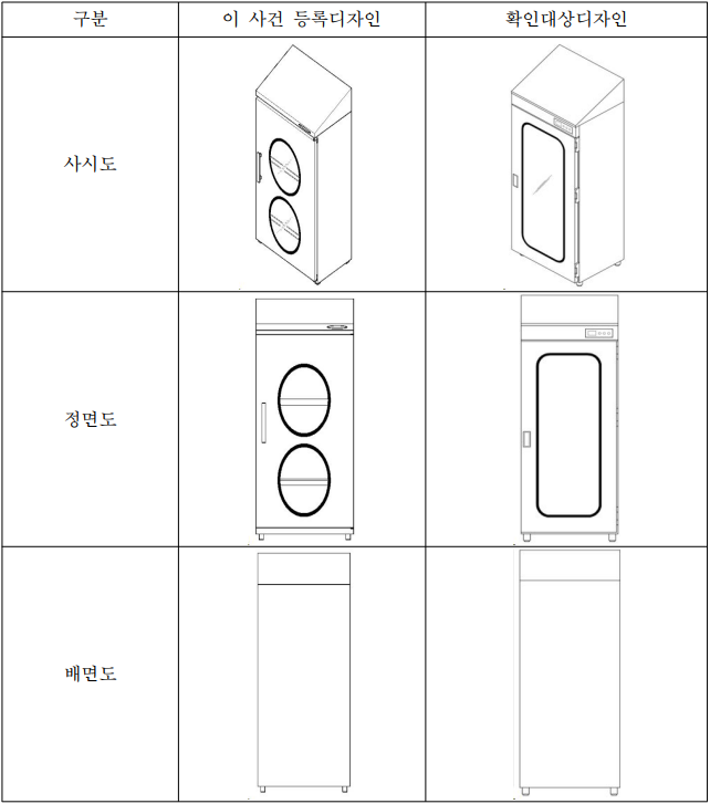 ㉮ 정면 도어에 형성된 투명창의 형상과 모양에 있어, 이 사건 디자인은 가운데 가로선이 2개 그어진 같은 크기의 원형의 투명창 2개가 도어의 중심부에 상하로 배치되어 있으나, 확인대상디자인은 모서리 부분이 라운딩 처리된 상하로 긴 장방형의 투명창 1개가 도어의 중심부에 배치되어 있는 점, ㉯ 작동버튼부의 형상과 모양에 있어, 이 사건 등록디자인은 폭이 좁게 구획된 상판 부분의 전면 우측에 좌우로 긴 타원형의 간략한 작동버튼부가 배치되어 있으나, 확인대상디자인은 상대적으로 폭이 넓게 구획된 본체 부분의 상부 우측에 좌우로 긴 직사각형 도형 내에 여러 개의 버튼이 배치되어 있는 형상과 모양의 작동버튼부가 배치되어 있는 점, ㉰ 도어의 개페손잡이의 형상과 모양에 있어, 이 사건 등록디자인은 돌출되어 있어 도어를 열 때 그 손잡이 사이에 손가락을 끼우도록 되어 있으나, 확인대상디자인은 손잡이에 홈이 형성되어 있어 도어를 열 때 손가락을 걸도록 되어 있는 점, ㉱ 정면의 도어와 우측면의 연결부위에 있어서, 이 사건 등록디자인은 상단과 하단 부분이 거의 보이지 않게 연결처리가 되어 있으나, 확인대상디자인은 상단과 하단은 물론 가운데 부분에도 연결고리가 뚜렷하게 형성되어 있는 점 등에서 차이가 있다.