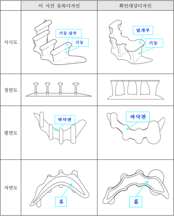 ㉮ 정면과 평면에서 볼 때 확인대상디자인은 네 개의 기둥이 상부로 갈수록 넓어지면서 네 개의 기둥 상부가 서로 연결되어 덮개부를 형성하고 있다. 반면, 이 사건 등록디자인은 바닥판에서부터 기둥 상부 직전까지는 네 개 기둥의 크기 변화가 거의 없다가 기둥 상부에서 단면의 크기가 균일하게 확대됨으로써, 기둥의 단면보다 넓고 얇은 판이 기둥의 윗부분에 연결되어 있는 형상을 갖고 있고, 기둥 상부는 서로 연결되어 있지 않다.