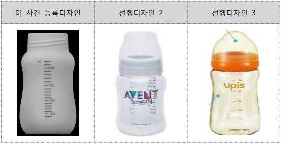 이 사건 등록디자인과 선행디자인 2, 3은 모두 ① 부드럽고 연속적인 곡면이 중앙에서 오목하게 들어간 테두리를 가지고 있으며, ② 표면에 눈금이 표시되어 있다는 점이 같고, 이 사건 디자인과 선행디자인 3의 경우 ③ 젖병 상단에 뚜껑부와 결합되는 2줄의 나선부가 형성되어 있다는 점에서 일치한다.