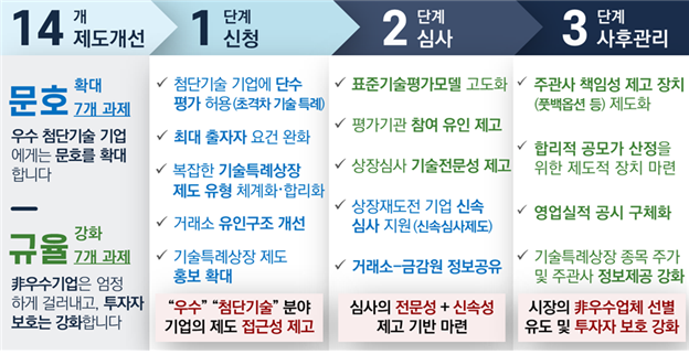 금융위원회에서 밝힌 「기술특례상장 제도 개선 방안」을 보면 「상장 신청 – 심사 – 사후관리」에 이르는 전 단계에서 제도와 집행 관행을 개선하는 14개 세부과제가 포함되었습니다.