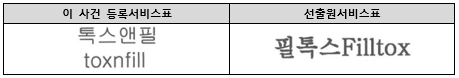이 사건 등록서비스표는 영문자 "toxnfill"과 그 한글 음역인 “톡스앤필”이 한글 부분과 그 아래 영문자 부분의 이단으로 배치된 문자 표장인 데 반하여, 선출원서비스표는 영문자 “Filltox"와 그 한글 음역인 “필톡스 ”가 한글과 영문자의 순서로 띄어쓰기 없이 연이어 써진 문자 표장으로서, 양 표장은 각 단어의 구성 및 배열의 차이로 말미암아 그 외관이 서로 다르다고 보아야 한다.