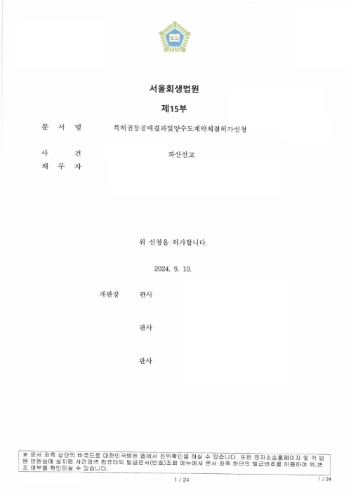 - 양도인의 법인 등기부 등본 상에 등록된 파산관재인을 통해서 양도 계약을 체결합니다.