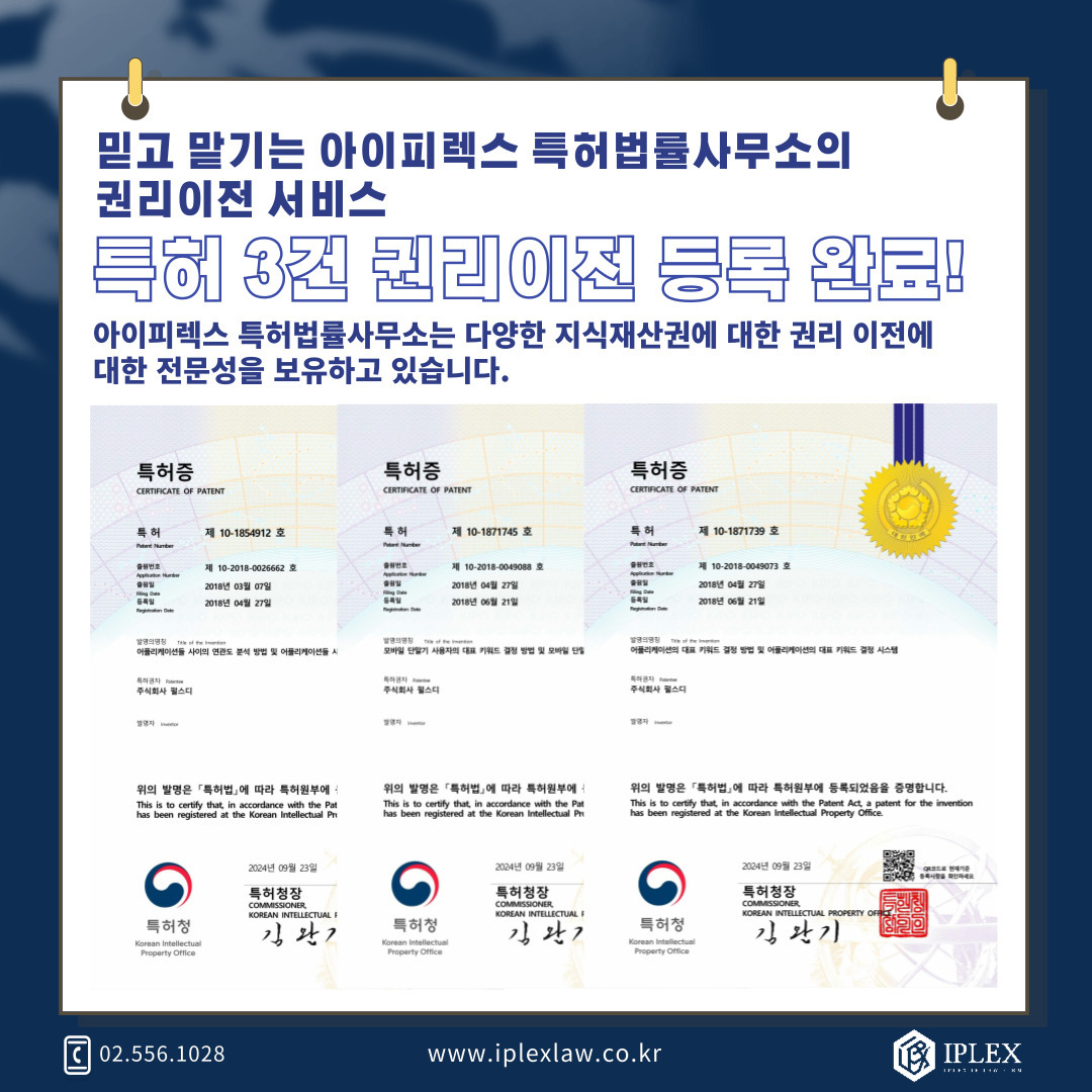 특허, 상표, 디자인 권리이전은 아이피렉스 특허법률사무소와 함께하세요. 여러분의 지식재산권을 책임지고 지켜드리겠습니다.