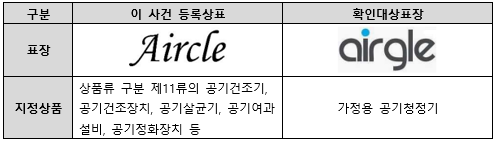 등록상표는 ‘에어클’, 확인대상표장은 ‘에어글’로 호칭되는데, 양 표장의 호칭은 전체 음절수가 모두 3음절로 동일할 뿐만 아니라 첫 번째와 두 번째 음절 또한 ‘에어’로 동일하다.