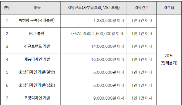 ※ 항목간 중복지원이 가능하나, 지원금액 총액이 2천만원을 넘을 수 없음(자부담 제외)