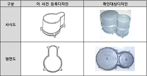 양 디자인은, ① 전체적인 형상에서, 확인대상디자인은 2개의 드럼통형 원이 짧은 연결부를 통해서 서로 연결되어서 드럼 악기의 느낌이 드는 반면에, 이 사건 등록디자인은 오뚝이 형상을 띠고 있는 점, ② 평면도에서, 확인대상디자인은 2개의 드럼통형 원 형상이 분리되어 있는데 반해서, 이 사건 등록디자인은 단지 오뚝이 모양일 뿐이고 원 형상이 2개로 분리되지 아니한 점, ③ 정면도에서, 확인대상디자인은 원통이 상하로 45도 각도의 단턱이 형성되어 구분되면서 상부가 하부보다 작은데 반해서, 이 사건 등록디자인은 단지 사각형의 형상만 띠고 있는 점, ④ 좌측면도에서, 확인대상디자인은 좌우의 크고 작은 원통이 연결부를 통해서 서로 구분되는데 반해서, 이 사건 등록디자인은 직사각형 형태인 점에서 구체적인 차이를 보이고 있다.