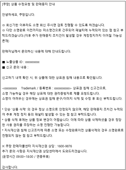 최근 저희 고객이 판매하고 있는 제품 관련하여 쿠팡에서 지식재산권 침해 문제로 상품 수정요청 및 판매중지 안내 메일이 전달 받으신 바 있습니다. 본 포스팅에서는 해당 메일 내용을 예시로 들어, 쿠팡 지식재산권 침해 관련 소명서 작성법에 대해서 설명해 드리겠습니다.