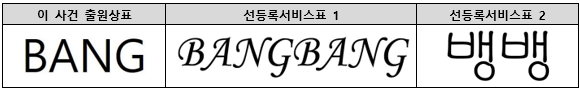 이 사건 출원상표는 ‘뱅’으로 호칭된다. 선등록서비스표 1, 2는 그 전체로서 ‘뱅뱅’으로 호칭되고, 숨이 거세게 나오는 파열음 ‘ㅂ’이 반복되는 것으로 전체적으로 이 사건 출원상표와 상이하게 청감된다.