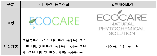 확인대상표장이 요부 부분과 이 사건 등록상표가 동일∙유사한지 여부에 관하여 살피건대, 양 표장은 나뭇잎의 위치, 물방울의 유무 등 도형 부분과 서체의 색상에 있어서 다소 차이가 있기는 하지만, 아래에서 보는 바와 같이 이 사건 등록상표와 확인대상표장의 요부는 모두 일반 수요자들에게 전체적으로 한글로 “에코케어”라고 호칭되고, ‘친환경적인 보살핌, 친환경적인 관리, 친환경적인 돌봄’ 등과 같은 의미로 관념된다고 할 것이다. 따라서 이 사건 등록상표와 확인대상표장은 그 호칭 및 관념에 있어서 서로 동일∙유사하다고 할 수 있다.