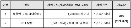 ※ PCT 지원단가는 대리인 비용 및 관납료 포함(단, 출원 이후에 소요되는 비용은 제외)