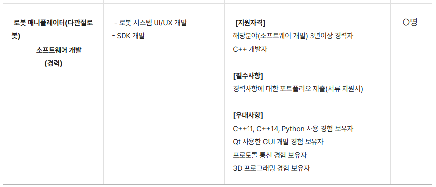 로봇 매니퓰레이터 SW 개발자 모집 요강을 살펴보면 하는 일이 크게 두 가지인 것을 확인할 수 있다.
