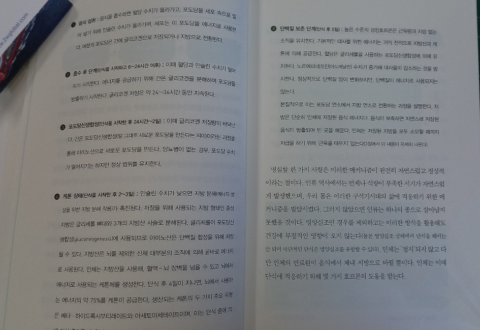 자기 전에 작년에 읽었던 '독소를 비우는 몸(제이슨 펑, 지미 무어 지음/ 라이팅하우스)'을 한번 더 읽었다. 책에서 소개하는 단식의 장점으로 체중과 체지방 감소 외에도 알츠하이머병 예방, 혈중 콜레스테롤 수치 감소, 인슐린 민감성 향상, 염증 감소, 수명 연장, 노화가 늦춰진다는 것 등이 있다. 내가 가장 얻고 싶은 효과가 노화 지연이다.