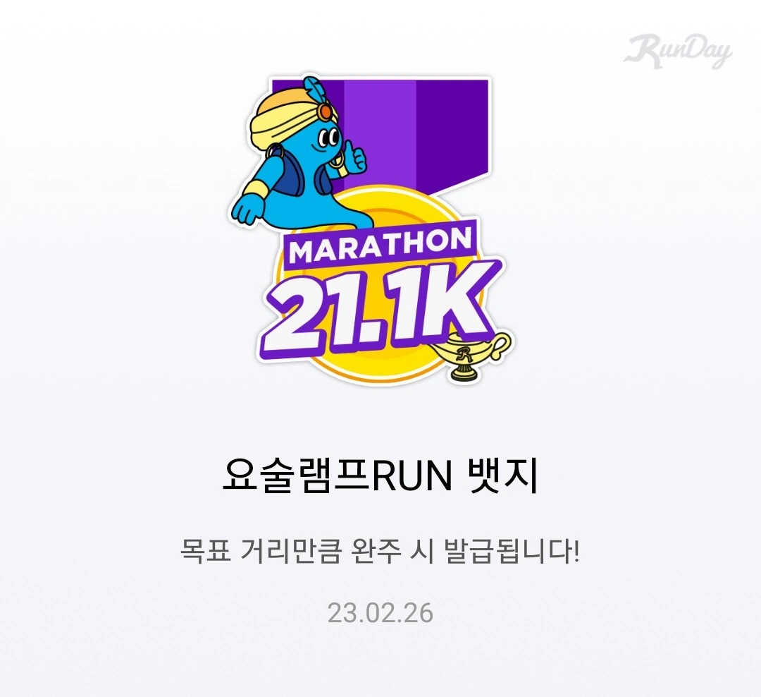 2월 26일, 마라톤 하프코스 달리기(비대면 달리기 대회)에 도전했다. 그동안 달리기를 거의 안 하고 게으름을 피웠는데 런데이 챌린지에 신청한 2월 달리기 일정이 돌아오고야 말았다. 한 달 전에 신청할 때의 마음은, 이제 날이 조금 풀렸으니 연습을 꾸준히 하면 21.1km를 달릴 수 있을 것 같았다.