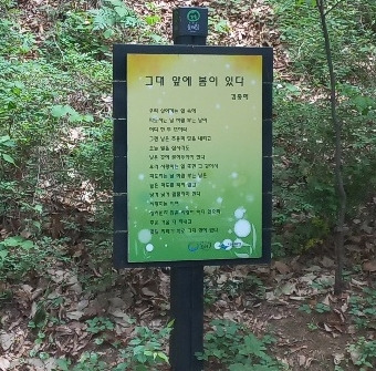중간 휴식을 위해 앉은자리 앞에 시 한 편이 적힌 표지판이 있었다. 숲해설사가 소리 내어 읽어보라고 했다. 난 이미 아무 생각 없이 속으로 한 번 읽었는데, 이상하다. 소리 내어 읽었을 뿐인데 눈물이 날 것 같았다. 내 마음속을 나도 모르게 휘감고 있던 미움, 우울, 좌절 같은 한삼덩굴이 뽑혀나가는 느낌이 들었다. 그냥 보고 느끼는 것과 말을 해서 내 귀에 들려주는 것에는 큰 차이가 있다는 것을 깨달았다.