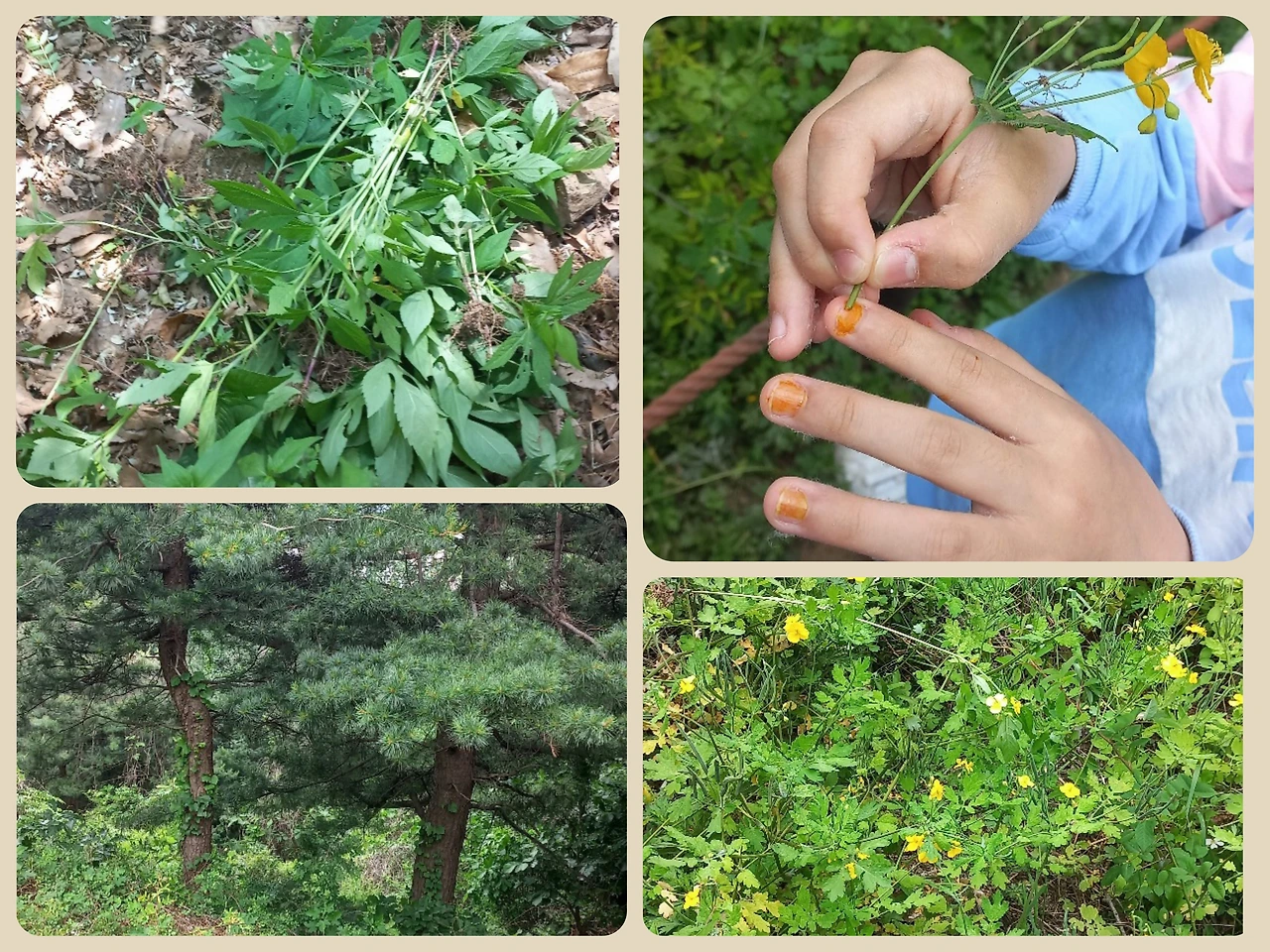 단풍돼지풀, 한삼덩굴, 애기똥풀을 손톱에 칠하는 딸, 애기똥풀