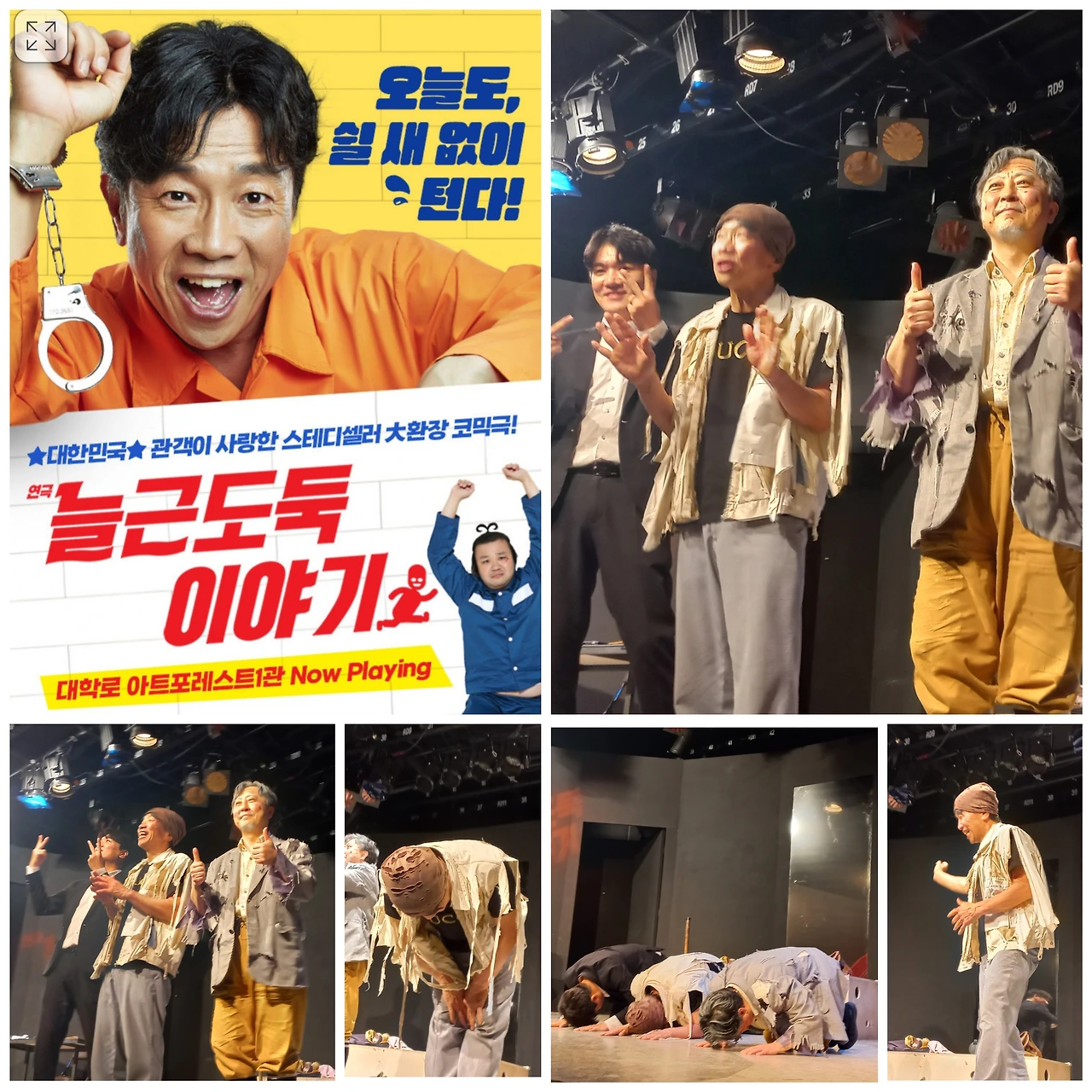 오늘, 오래전 도둑맞은 일이 생각난 이유는대학로에서 <늘근도둑 이야기>라는 연극을 보고 와서다. 감옥에서 만난 두 늙은 도둑이 마지막 노후대비(?)로 한탕하러 갔다가 실패하고 잡히는 내용인데, 정치와 시사 풍자로 100분 내내 쉴 틈 없이 웃고 뭔가 해야 했다.(관객들에게 계속 뭘 시킨다) 이 연극은 시간 도둑이다. 세상에 이렇게 사랑스러운 도둑만 있으면 좋으련만.