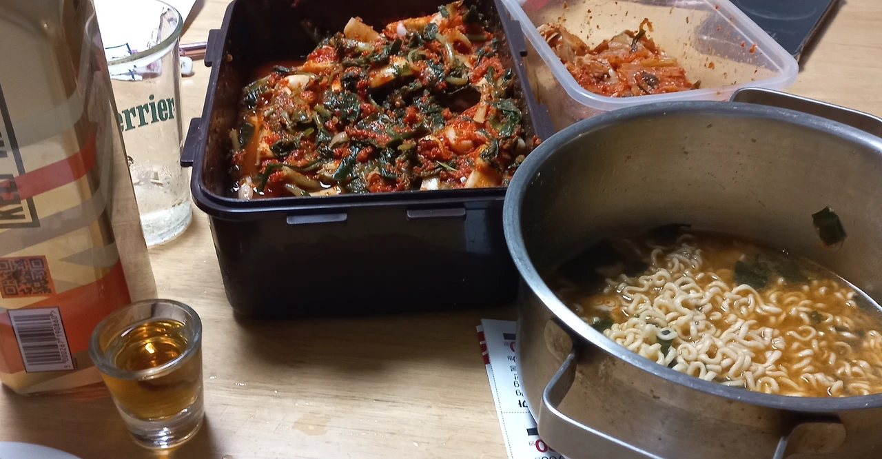 남편이라도 나를 좀 말려주면 좋으련만, 빛의 속도로 냄비에 물을 받는다. 라면 익는 냄새가 풍기기 시작하고... 나는 여행 전에 엄마한테서 가져온 총각김치가 생각나 통째로 식탁에 올렸다.