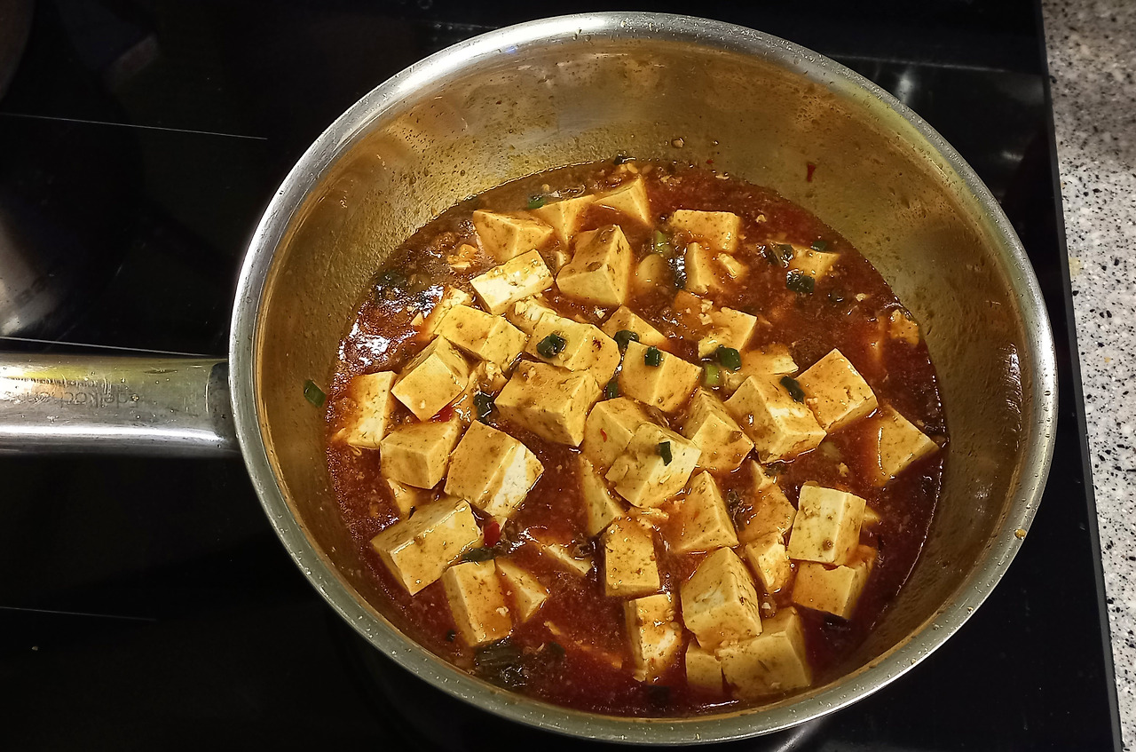 시판되는 마파두부 소스와 두부, 약간의 채소만 있으면 된다. 냉장고 속에 브로콜리와 쪽파, 버섯이 있어 조금 다져 넣고 볶다가 소스와 물, 두부 한모를 넣고 끓여 식힌 후 통에 담았다. 4~5인분 정도의 양이지만 둘이 한 끼에 다 먹을 것이다. 우리 집 아이들은 카레라이스 보다 이걸 더 좋아한다.