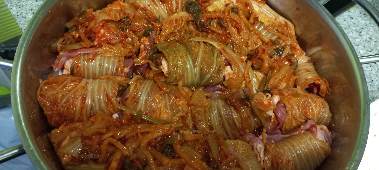 김장김치 한 포기, 얇고 길게 썰린 앞다리살 그리고 시간만 넉넉히 있으면 아이들의 최애 김치찜을 만들 수 있다. 썰지 않고 밑동만 잘라낸 김치 한 장에 앞다리살을 올려 둘둘 말아준다. 머리부터 발끝까지 꼭 끌어안은 그들을 큰 냄비 안에 차곡차곡 눕히고 물을 붓는다. 된장 한 스푼과 조미료 약간, 파와 양파를 썰어 넣고 푹 끓이면 완성이다. 이것만 있으면 기본 밥 두 그릇이다.