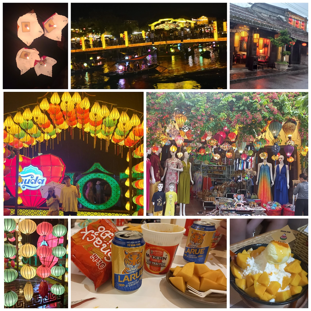 오늘의 마지막 일정은 투본 강에서 사공이 노를 젓는 작은 배를 타고 촛불이 켜진 연꽃종이를 띄우며 소원을 비는 거였다. 나는 이 배를 타는 것보다 강변 카페에 앉아 배가 지나다니는 모습과 호이안의 아름다운 야경을 보며 맥주를 한 잔 마시고 싶었다. 하지만 패키지여행을 선택한 사람이라면 그런 낭만은 포기해야 한다. 맛있어 보이는 현지 식당을 다 놔두고 한국에서도 안 먹을 싸구려 뷔페식당에서 저녁을 먹고 잠깐의 자유시간이 주어졌다. 야시장을 둘러본 후 약속시간에 맞춰 배 타는 곳으로 갔다. 강은 좁고 악취가 심했다. 소원을 빌기도 전에 빗물에 촛불이 꺼졌다. 하늘조차 패키지 여행자의 낭만을 허락하지 않는 건가.
