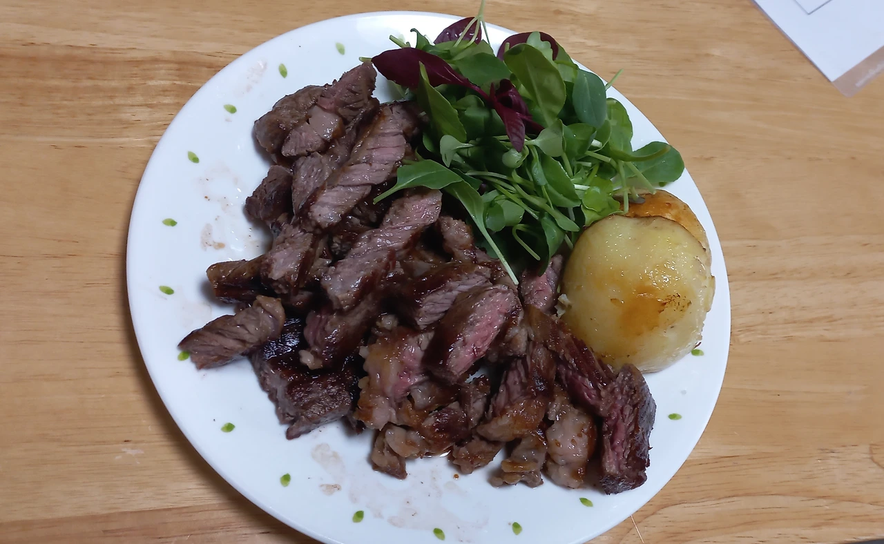 소고기구이와 어린잎 채소, 구운 감자