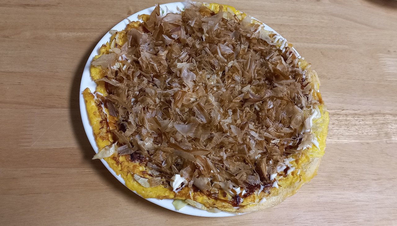 계란을 풀어 양배추와 오징어다리를 다져 넣고 부쳤다. 부침개처럼 넓게 부쳐 마요네즈와 데리야키 소스를 뿌리고 가쓰오부시를 올렸다. 다코야키 맛을 기대했지만 밀가루가 안 들어가서 조금 다른 맛이 났다. 그래도 꽤 괜찮은 맛이었다. 어제 끓인 미역국과 함께 먹었다.