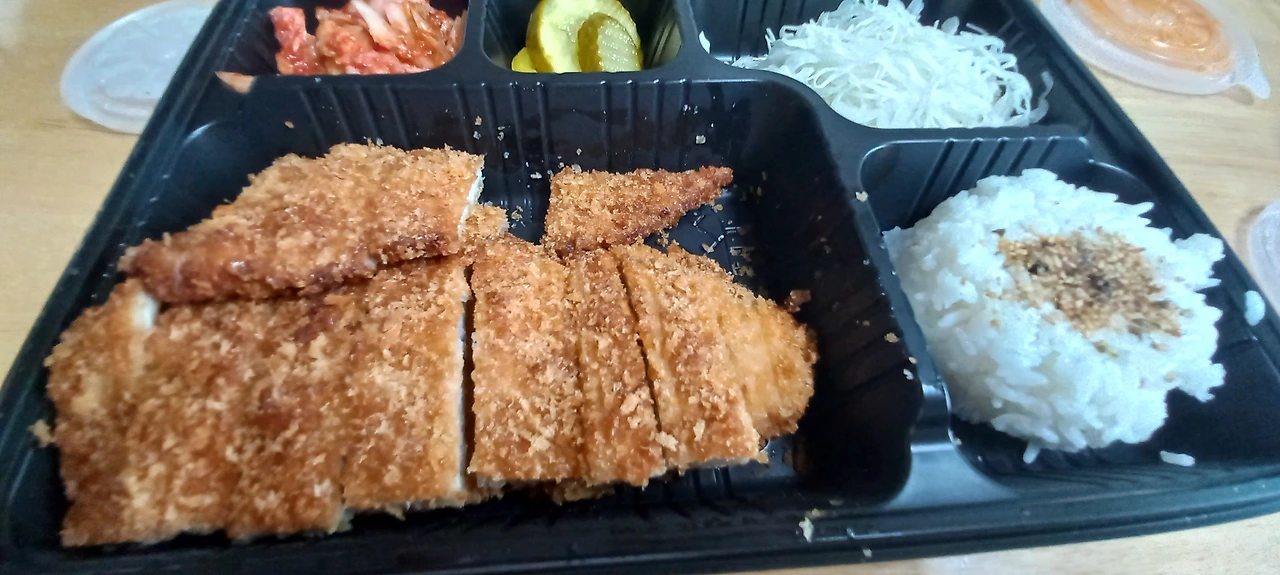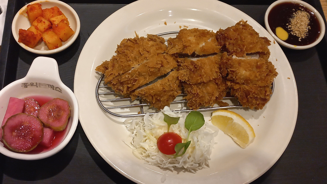 엊그제 언니랑 돈가스를 먹었다는 내 말에 아이들이 돈가스를 먹고 싶다고 했다. 남편과 아이들에게 돈가스를 주문해 주고 나는 남편의 돈가스 몇 점과 양배추, 콩국물, 복숭아를 먹었다.